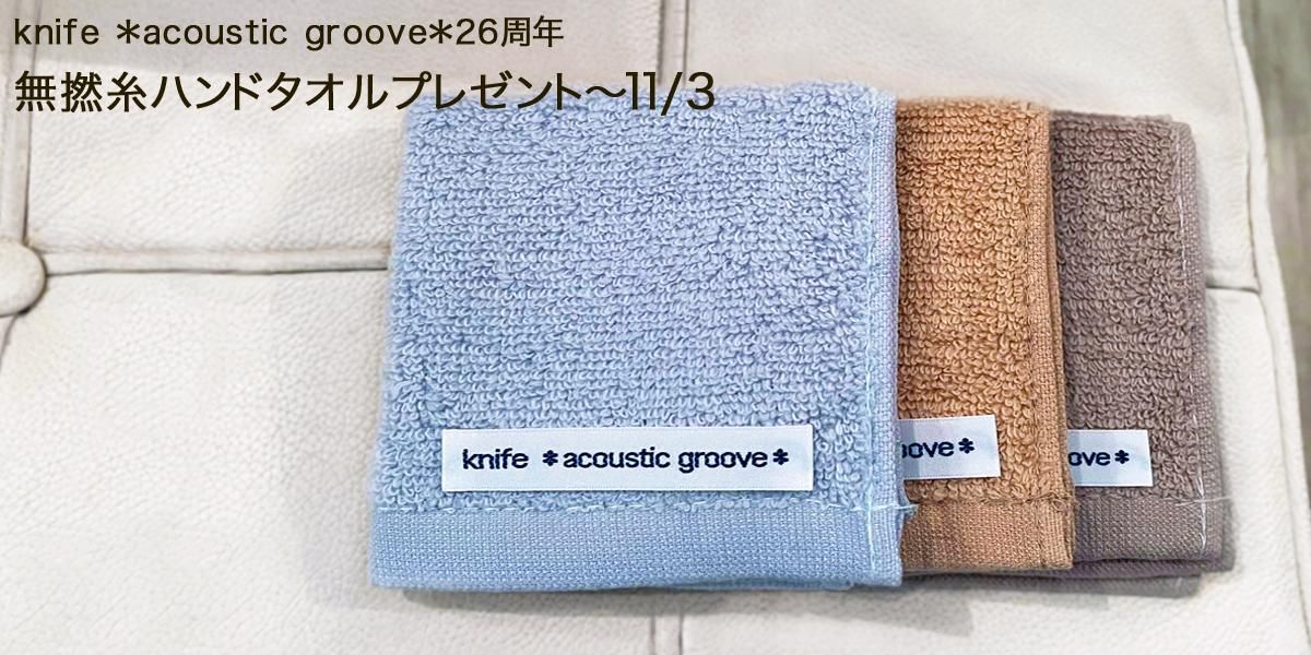 いつもknife *acoustic groove*をご愛用頂き、ありがとうございます。11/3(祭月)までの間、knife *acoustic groove*代官山サロンか代官山WEBストアをご利用頂いた全ての皆さまに、無撚糸ハンドタオルを差し上げます。ご希望のカラーのある場合、代官山WEBストアでは備考欄よりお知らせ下さい(サックス/キャメル/モカ)。状況により、期間内でも終了させて頂きます。26周年、ありがとうございます!