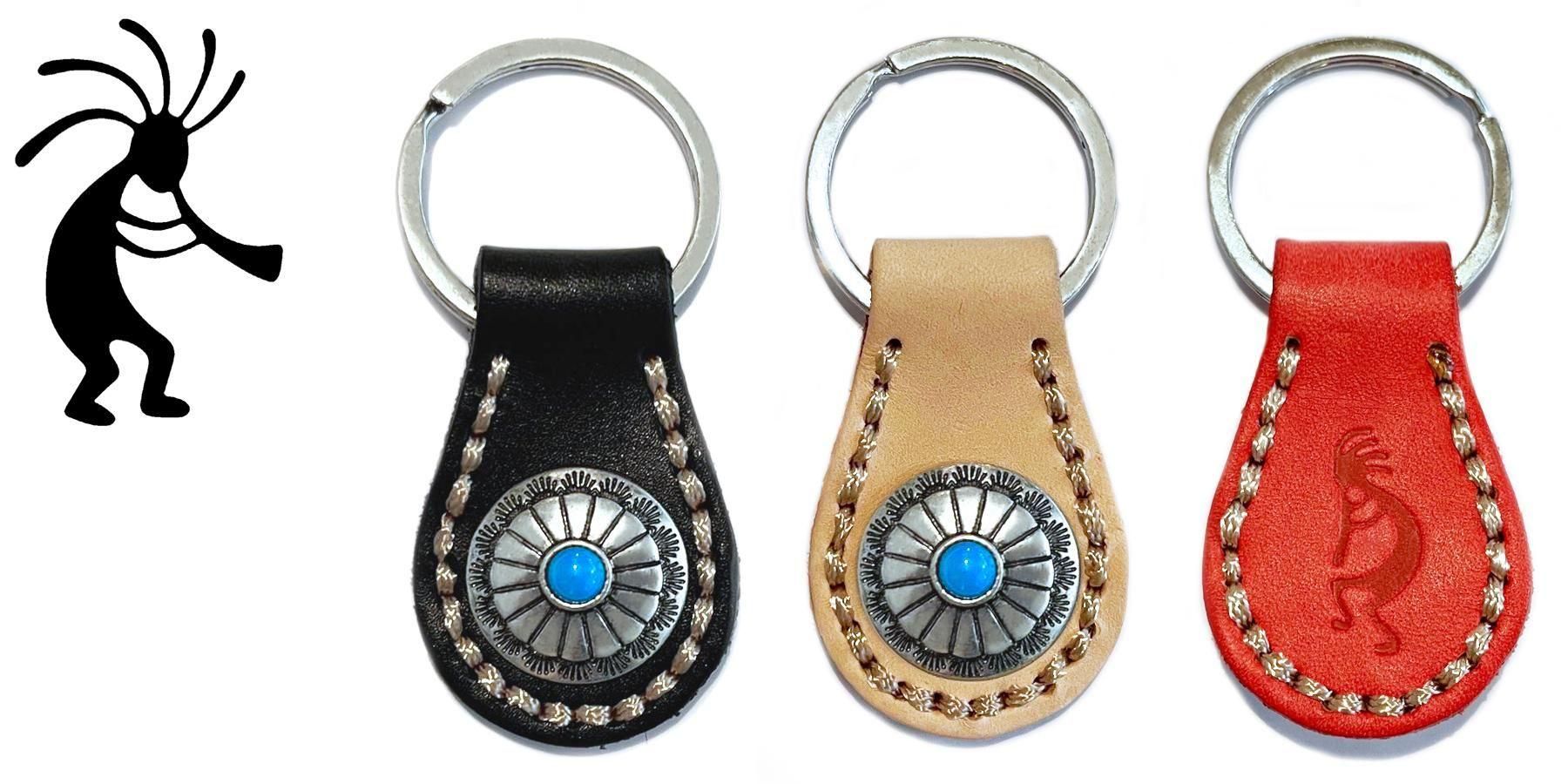 頑強な牛革サドルレザーの本体に、フラワーコンチョを留めました。手のひらサイズで使い勝手の良い、キーリングです。背面には、ココペリの大きな刻印を。笛を吹きながら踊るココペリは、ネイティブアメリカンにとって幸運や豊作の精霊です。古くから岩絵にも描かれて来た、幸せの象徴です。